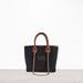 Elena canvas handbag features an exquisite navy or black handbag, elegantly adorned with rich tan handles. Personalize it with your initials for a touch of embroidery.