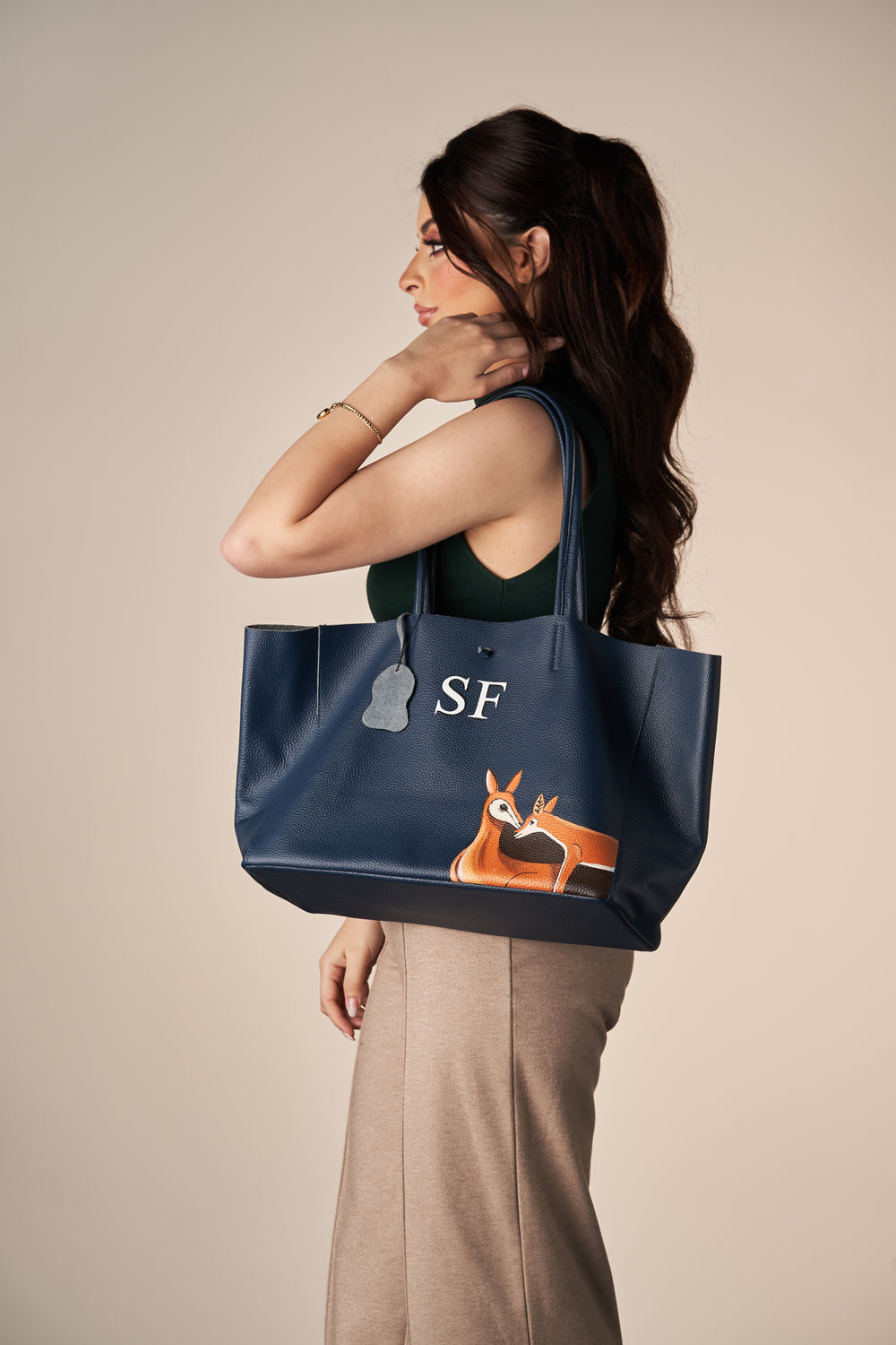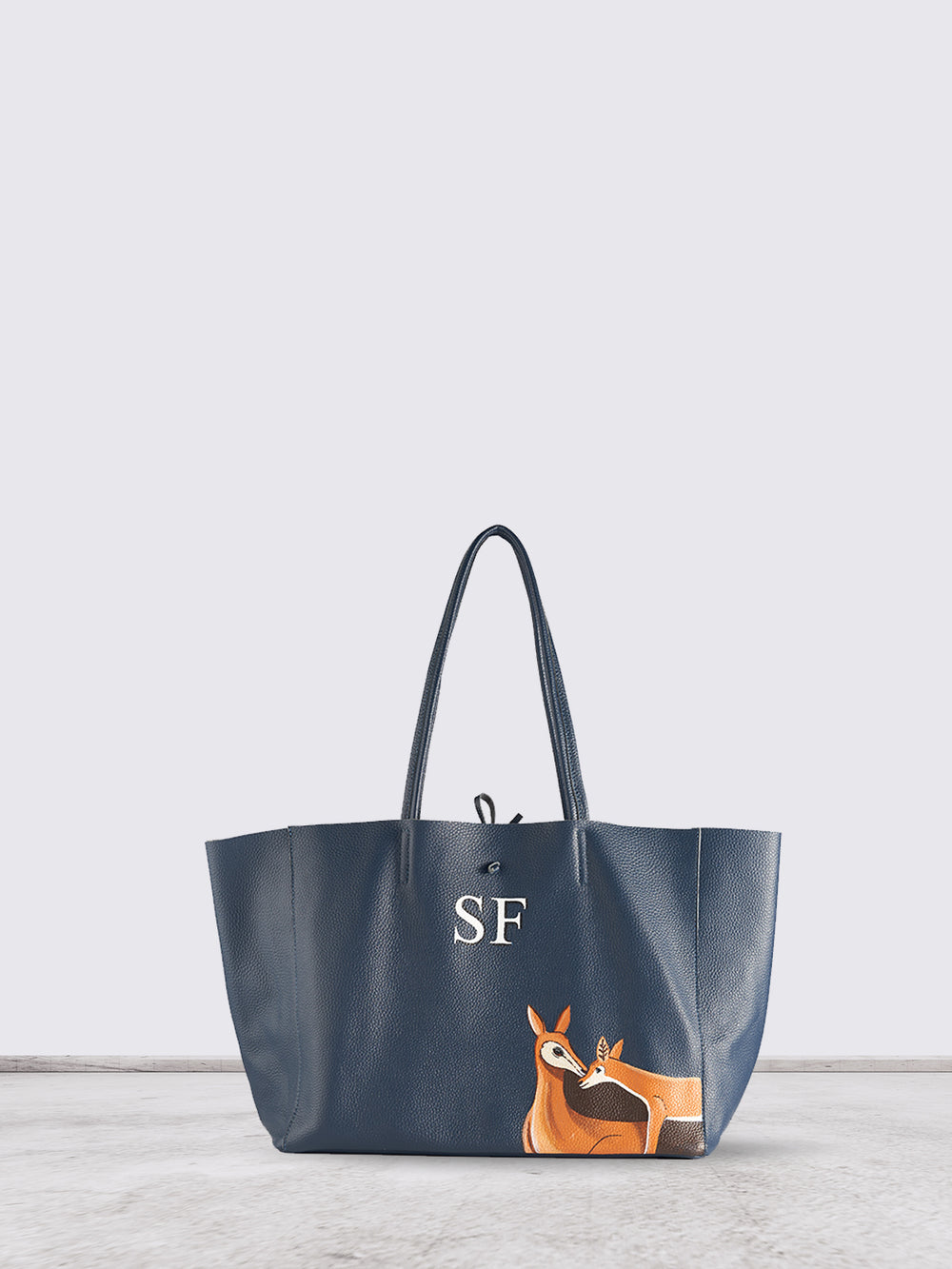 This stylish blue tote bag features a charming gazalle design alongside the customize initials, making it a perfect accessory for lovers and those who appreciate unique fashion. Crafted from durable materials, it offers ample space for daily essentials while maintaining a lightweight feel. The eye-catching color and playful motif make it suitable for various occasions, from casual outings to shopping trips. Elevate your accessory collection with this delightful and functional tote bag.