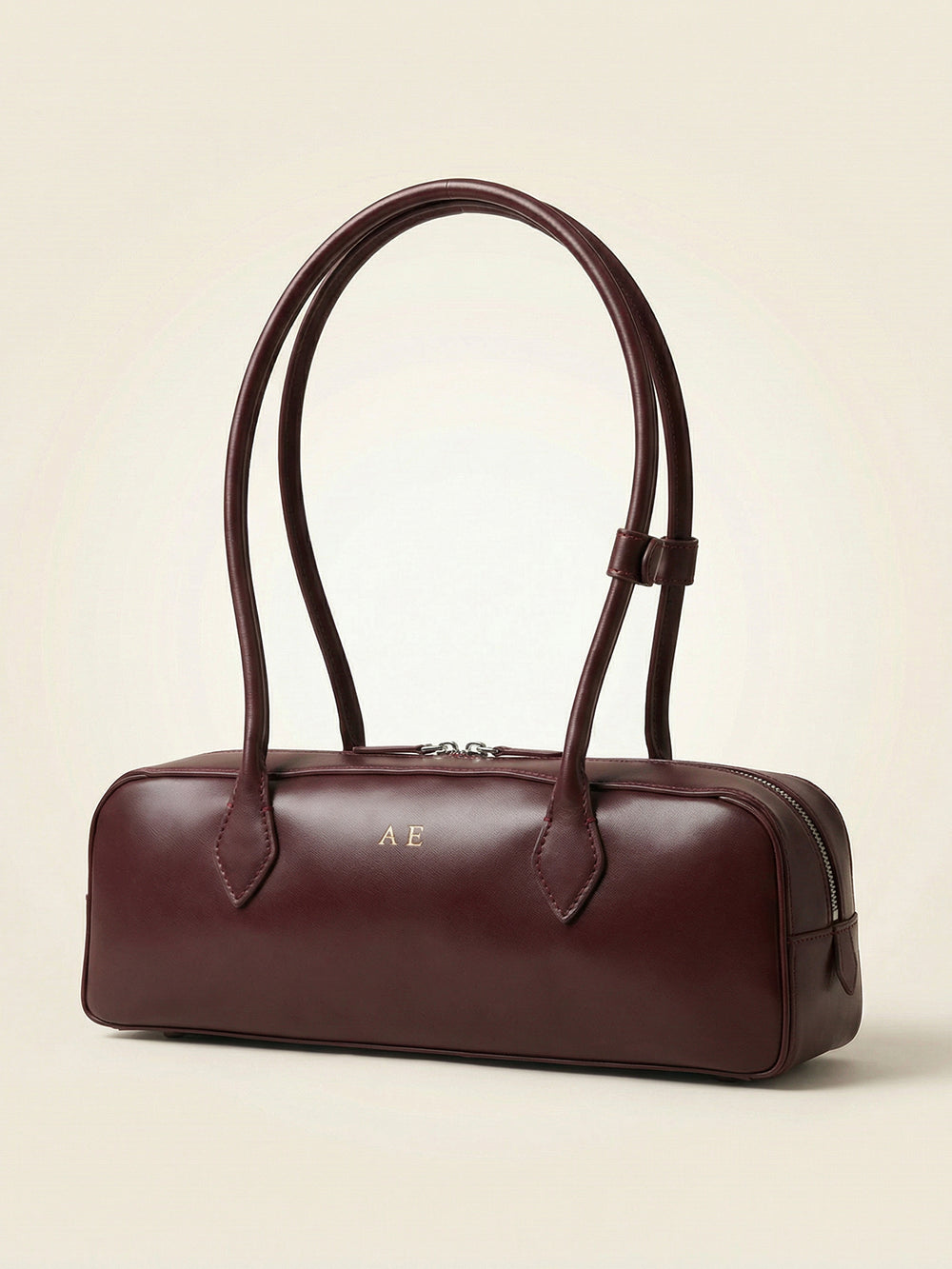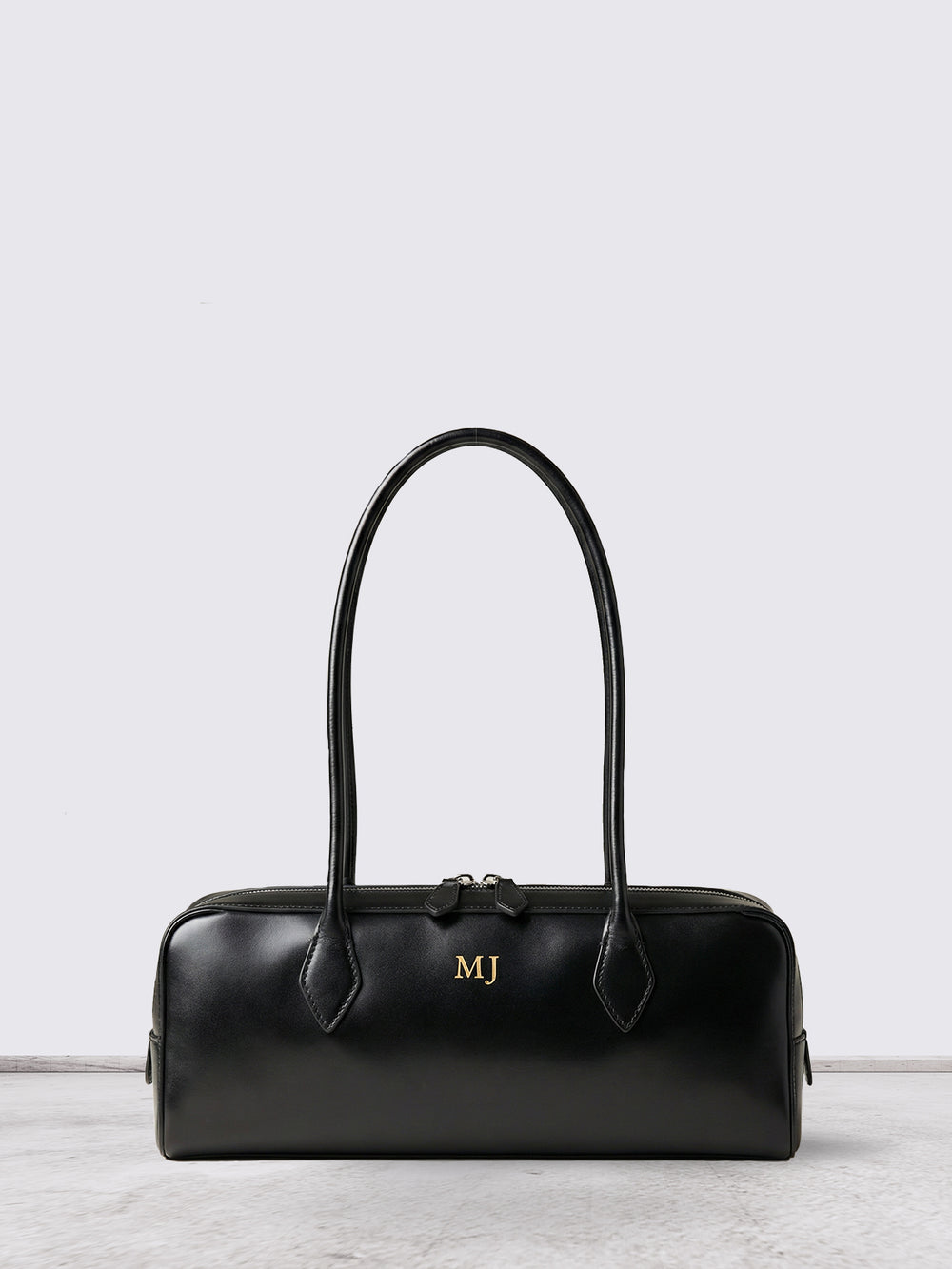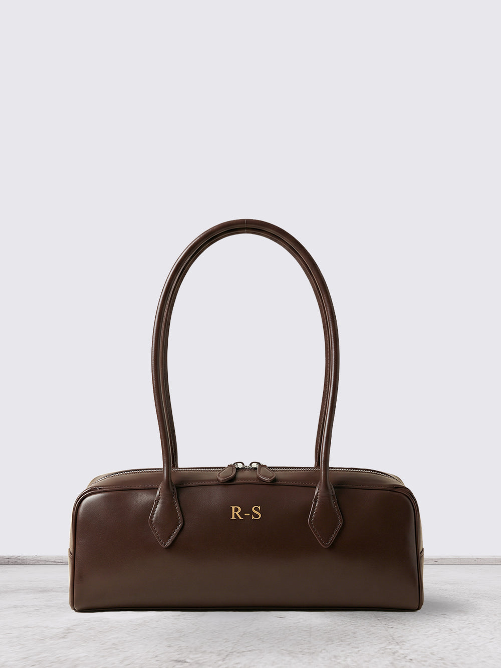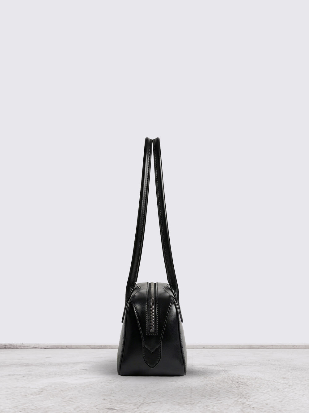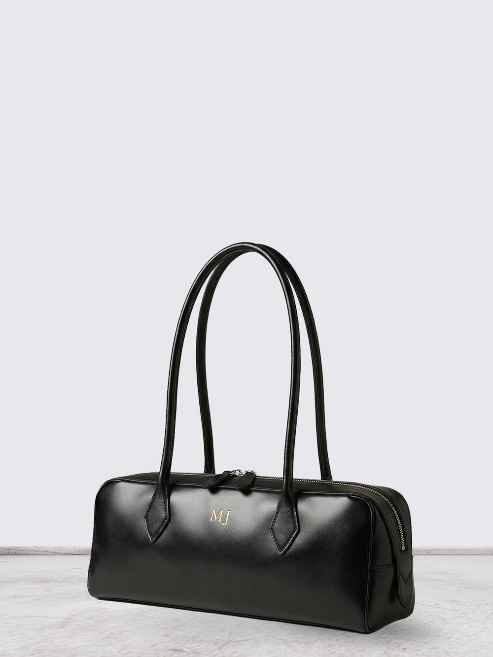 Crafted from smooth premium leather, its slim horizontal body creates a distinctive profile that feels architectural yet feminine. The long structured handle adds graceful height, while the clean lines maintain a sharp, understated presence.